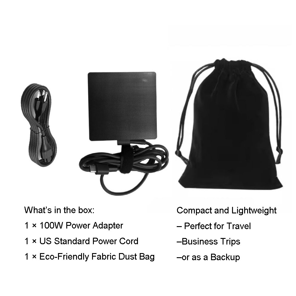 What’s in the box: 1 × 100W Power Adapter 1 × US Standard Power Cord 1 × Eco-Friendly Fabric Dust Bag
